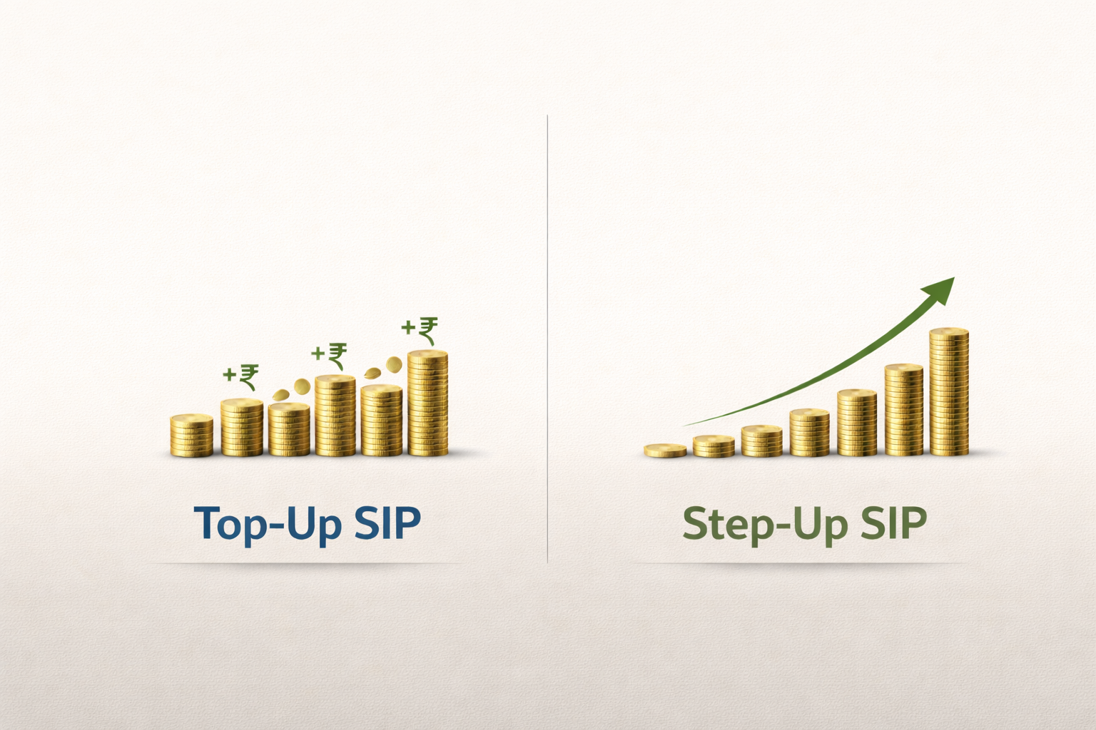Step Up SIP increases the base SIP amount automatically at predefined intervals (for example, increasing ₹5,000 to ₹6,000 annually). Top Up SIP adds an additional fixed amount to the existing SIP without modifying the original SIP amount. Both are designed to gradually increase investments over time.