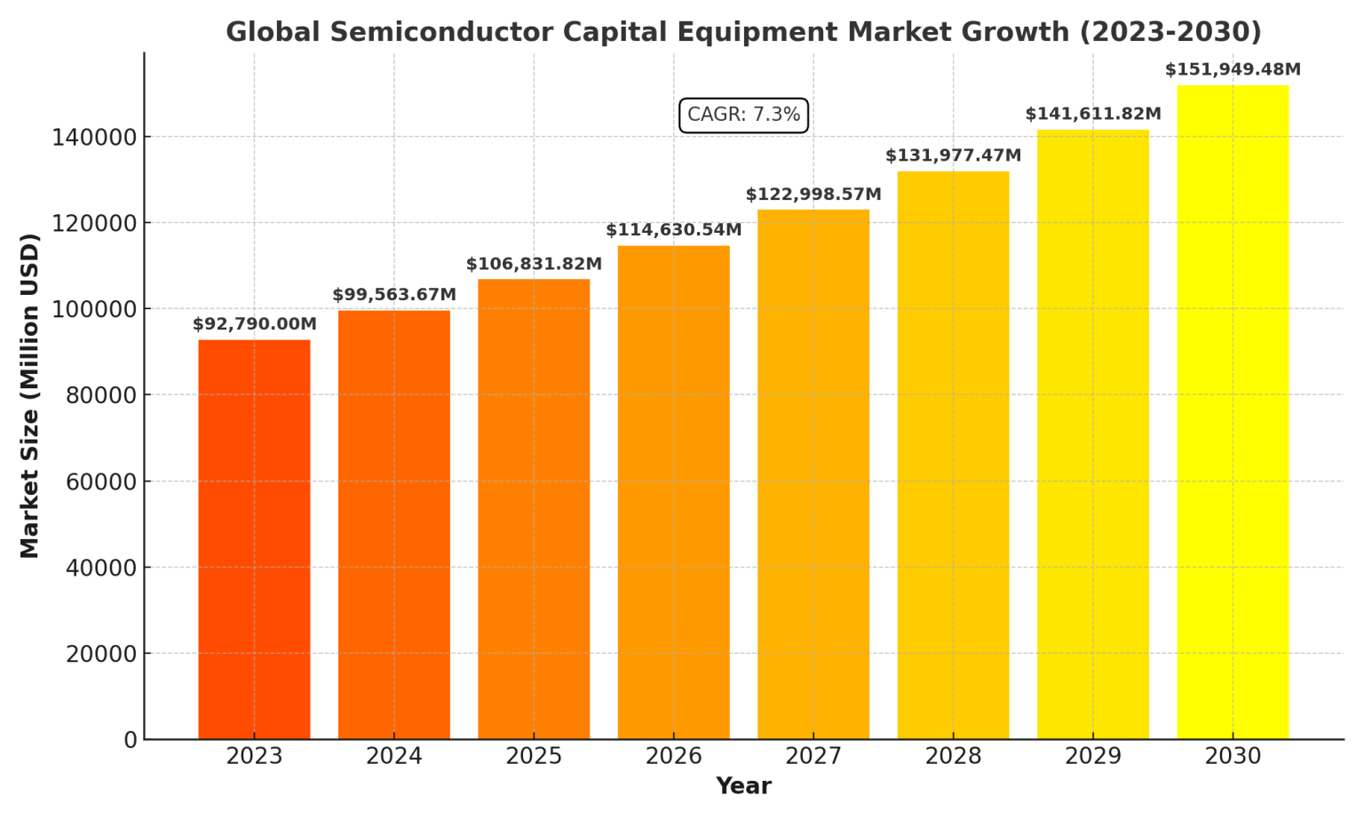 Global Semiconductor Capital Equipment Market was valued at 92790 million in 2023 and is projected to reach 144520 million USD by 2030, registering a CAGR of 7.3% during the forecast period 2026–2034. The market is expanding steadily, driven by advanced node manufacturing, foundry capacity expansion, and AI-driven semiconductor demand.