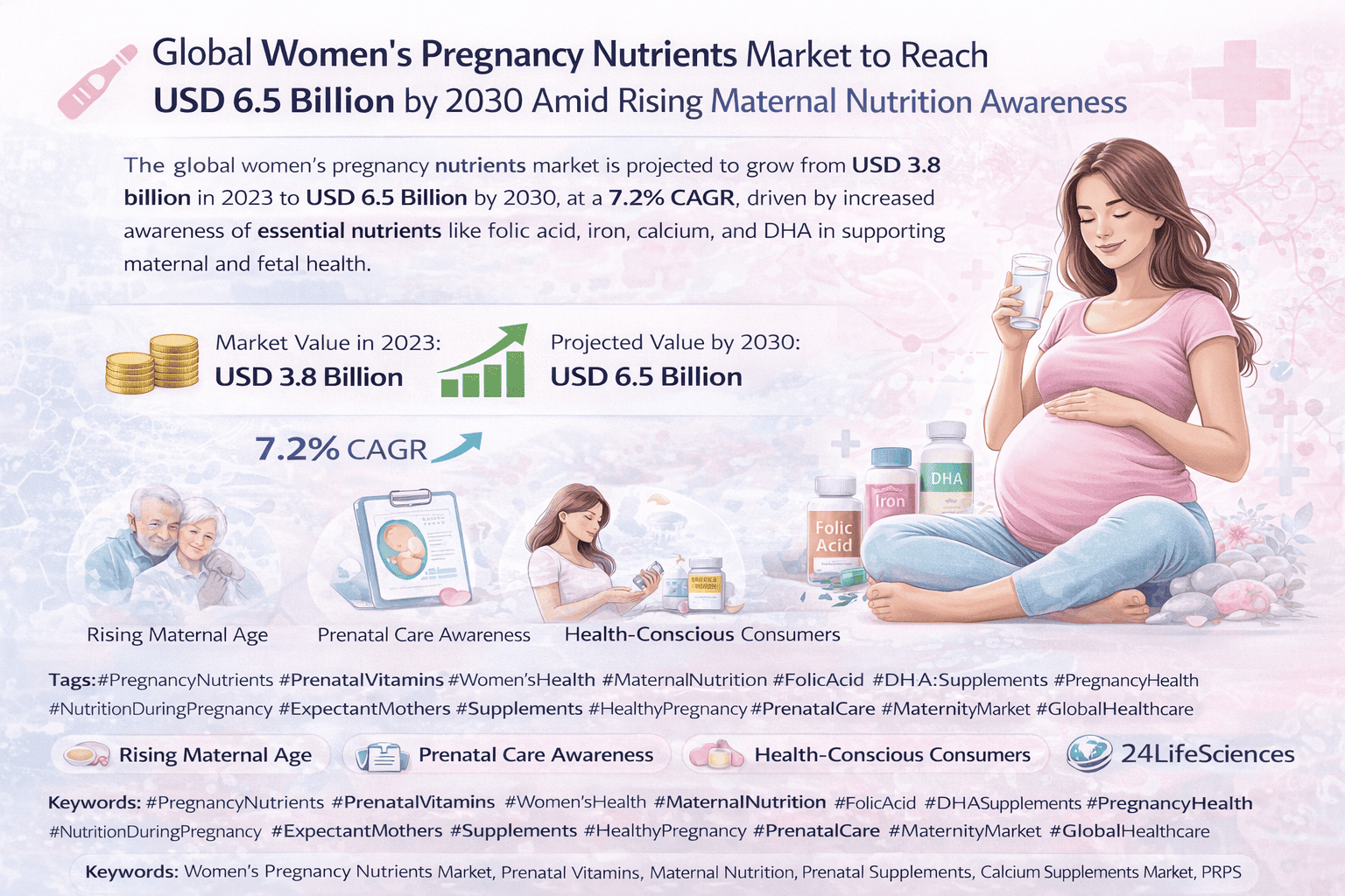 According to a newly published market research report by 24LifeSciences, the global women's pregnancy nutrients market was valued at USD 3.8 billion in 2023 and is projected to reach USD 6.5 billion by 2030, growing at a compound annual growth rate (CAGR) of 7.2% during the forecast period 2024–2030.