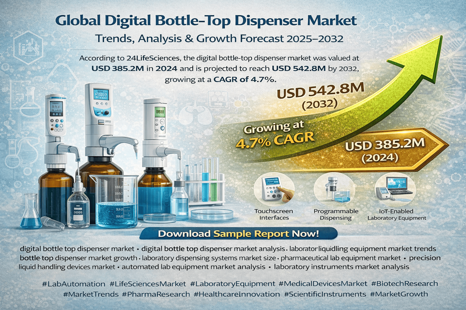 According to a newly published market research report by 24LifeSciences, global digital bottle-top dispenser market was valued at USD 385.2 million in 2024 and is projected to reach USD 542.8 million by 2032, growing at a compound annual growth rate (CAGR) of 4.7% during the forecast period 2025–2032.