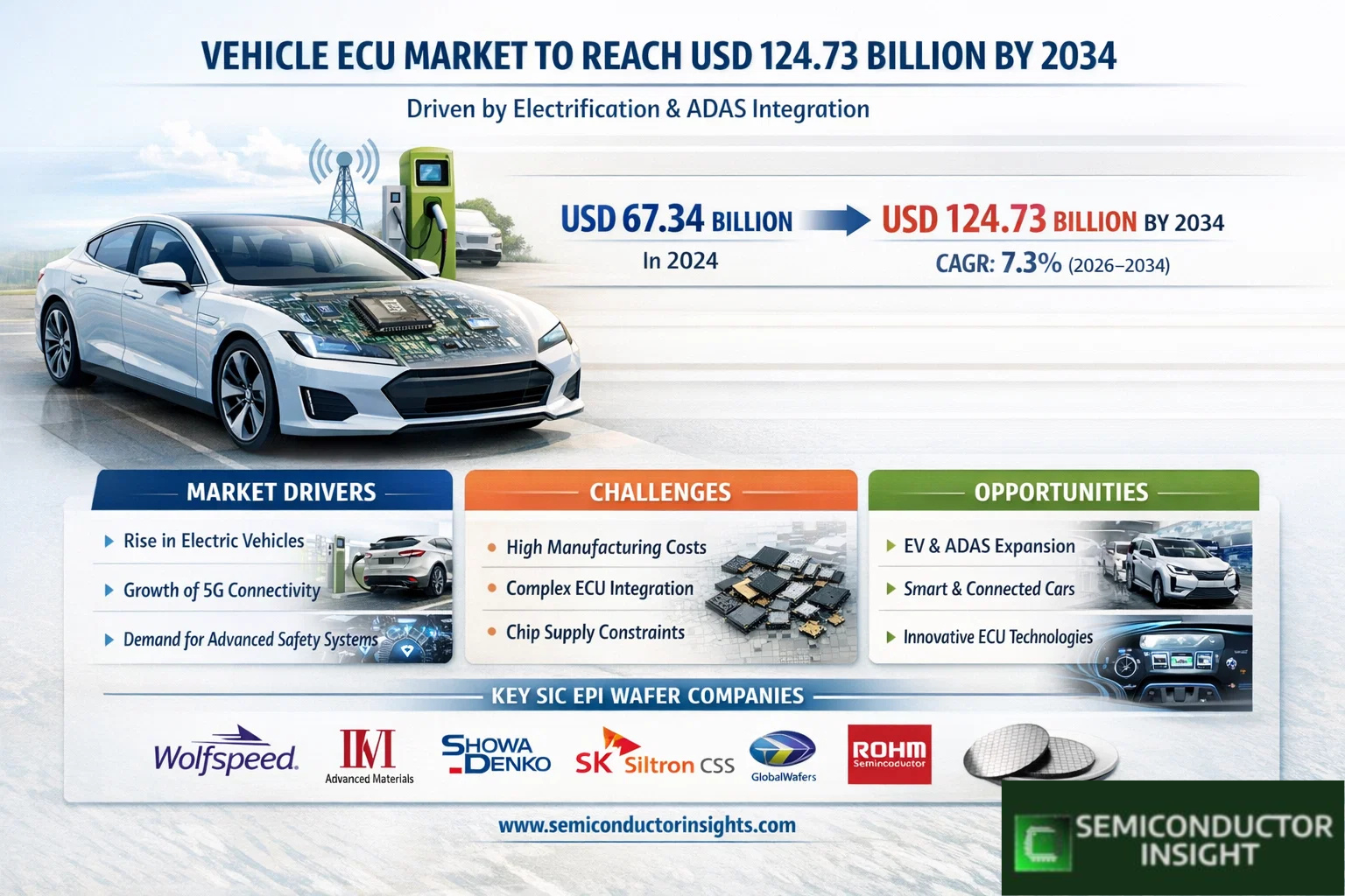 Global Vehicle Electronic Control Units (ECU) market was valued at USD 67.34 billion in 2024 and is projected to reach USD 124.73 billion by 2034, expanding at a CAGR of 7.3% during the forecast period 2026–2034. The market is witnessing steady growth as vehicle electrification, connectivity, and advanced safety integration continue to redefine automotive electronic architectures worldwide.