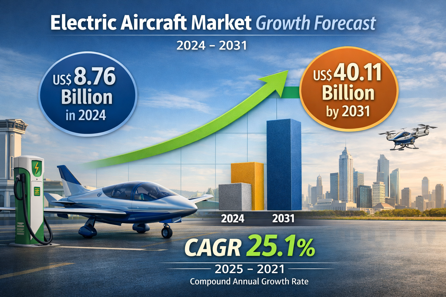 The electric aircraft market was valued at US$ 8.76 billion in 2024 and is projected to reach US$ 40.11 billion by 2031, registering a CAGR of 25.1% during the forecast period (2025–2031).The market is gaining significant momentum as the global aviation industry shifts toward sustainable and energy-efficient technologies. Increasing environmental concerns, stricter emission regulations, and advancements in electric propulsion systems are encouraging aerospace companies to invest heavily in electric aviation solutions.