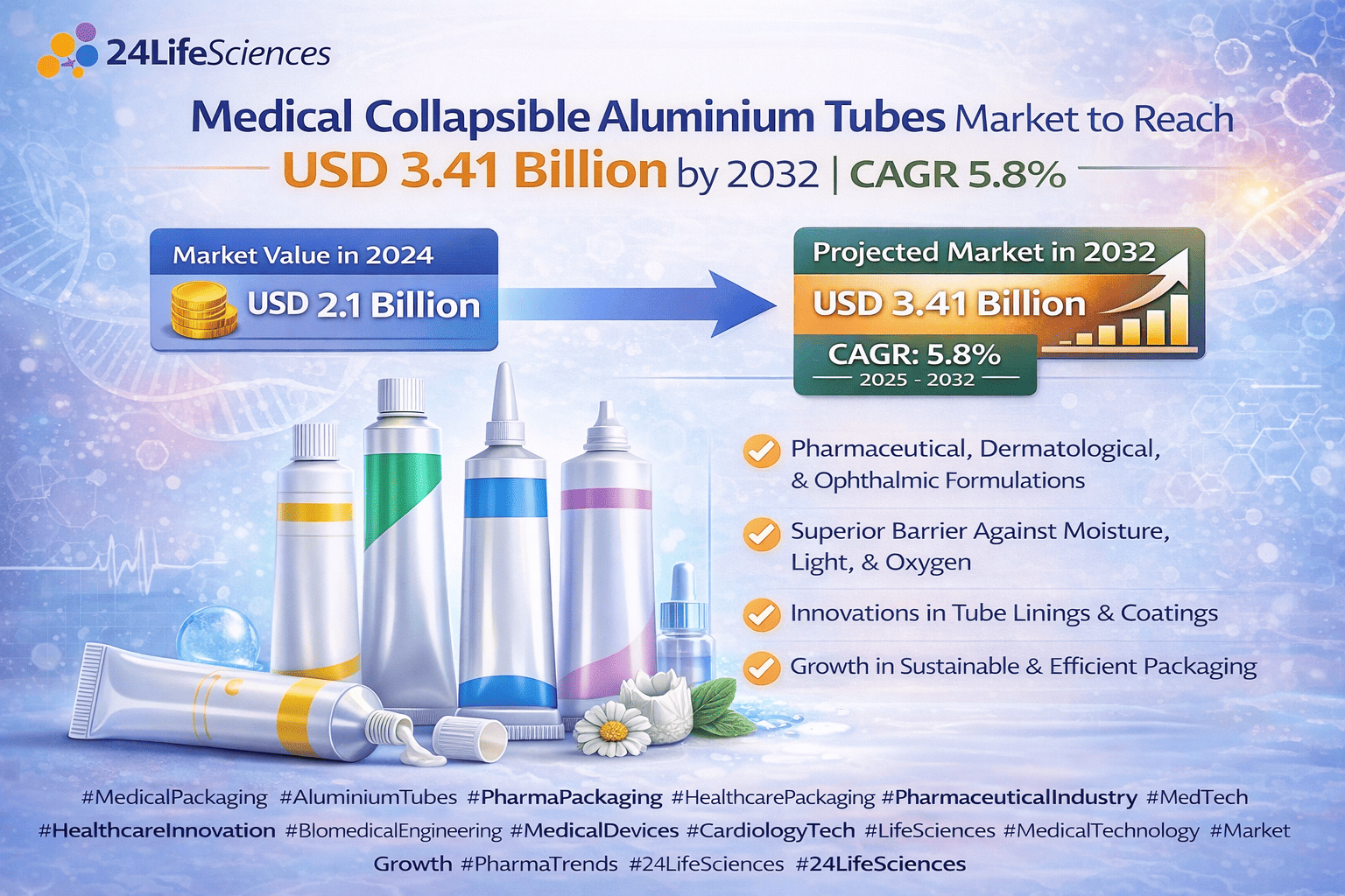 According to a newly published market research report by 24LifeSciences, the global medical collapsible aluminium tubes market was valued at USD 2.1 billion in 2024 and is projected to reach USD 3.41 billion by 2032, growing at a compound annual growth rate (CAGR) of 5.8% during the forecast period 20252032.