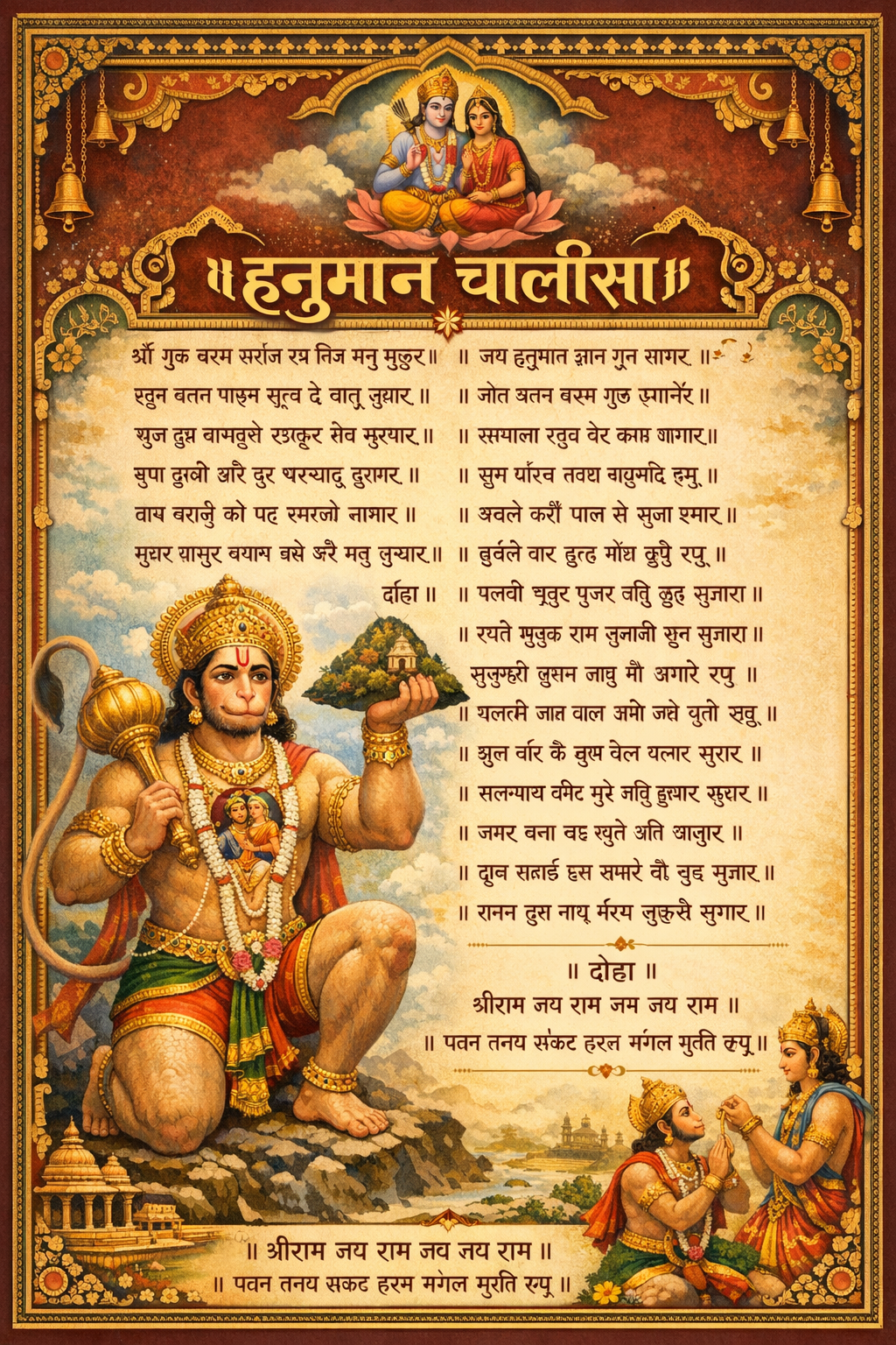 The Hanuman Chalisa is one of the most powerful and widely recited Hindu devotional hymns dedicated to Lord Hanuman, the symbol of strength, devotion, and courage. Written by the great poet Goswami Tulsidas, this sacred prayer contains 40 verses praising the greatness of Lord Hanuman and his unwavering devotion to Lord Rama.