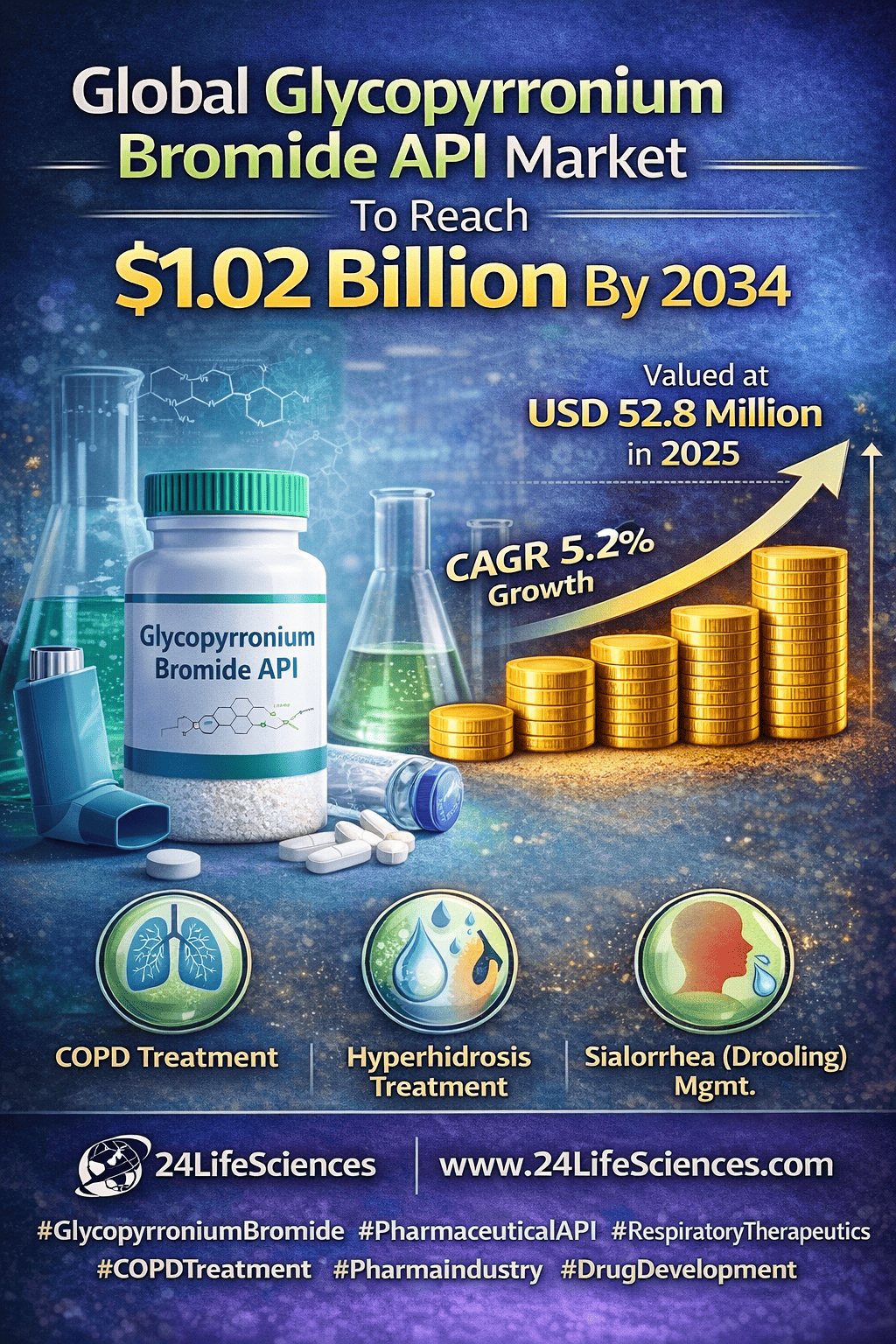 According to a newly published market research report by 24LifeSciences, global glycopyrronium bromide API market was valued at USD 52.8 million in 2025 and is projected to reach USD 83.7 million by 2034, growing at a compound annual growth rate (CAGR) of 5.2% during the forecast period 2026–2034.