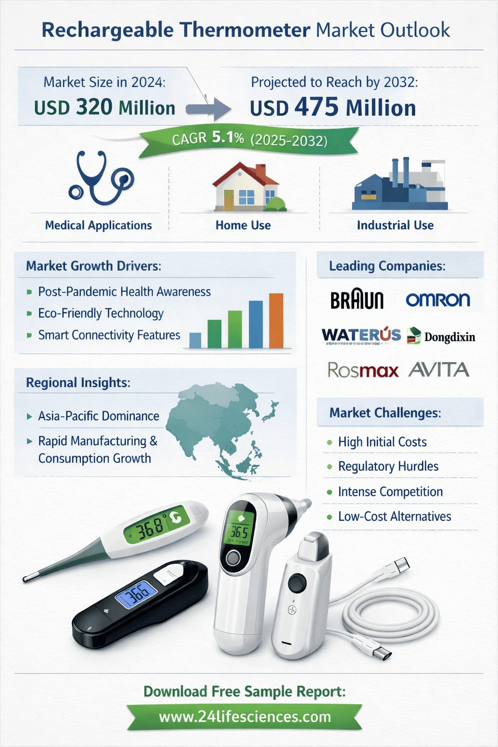 According to a newly published market research report by 24LifeSciences, global rechargeable thermometer market was valued at USD 320 million in 2024 and is projected to reach USD 475 million by 2032, growing at a compound annual growth rate (CAGR) of 5.1% during the forecast period 20252032.
