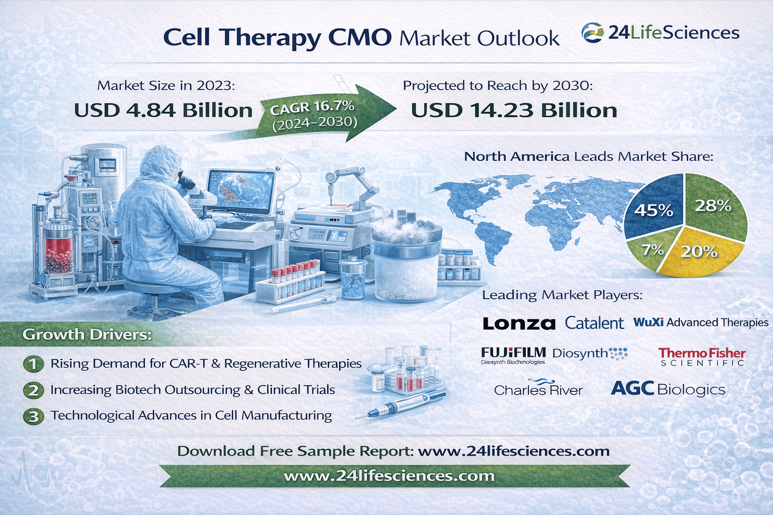 According to a newly published market research report by 24LifeSciences, the global cell therapy CMO market was valued at USD 4.84 billion in 2023 and is projected to reach USD 14.23 billion by 2030, growing at a compound annual growth rate (CAGR) of 16.7% during the forecast period 2024–2030.