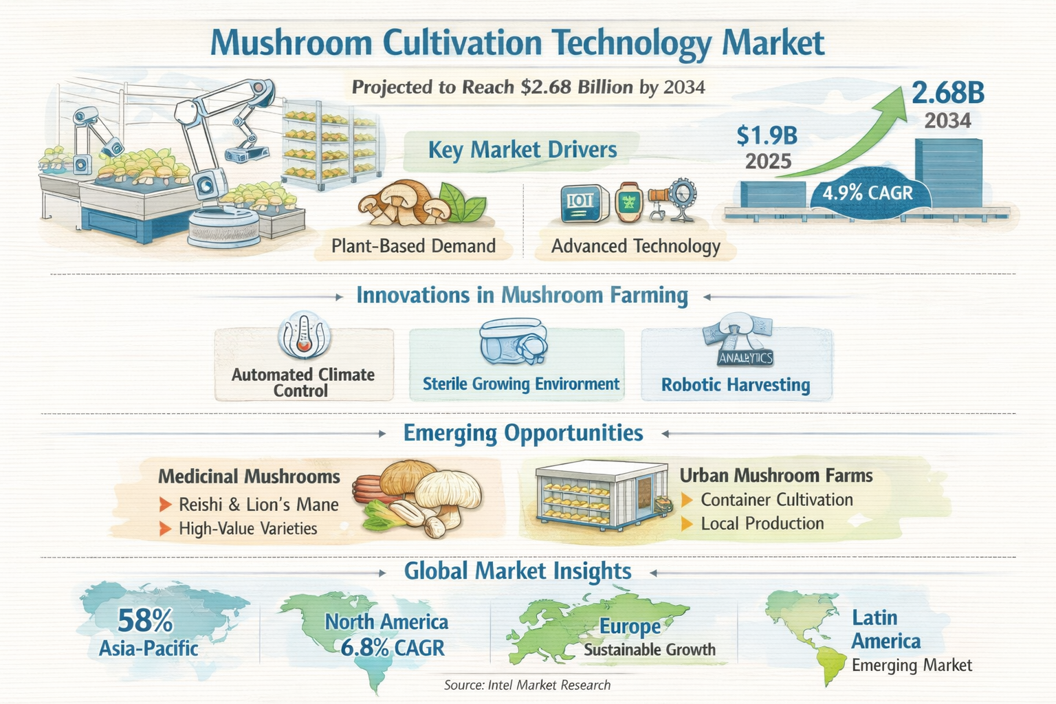 • North America: Fastest-growing region with 6.8% CAGR, driven by organic mushroom demand and vertical farming adoption
