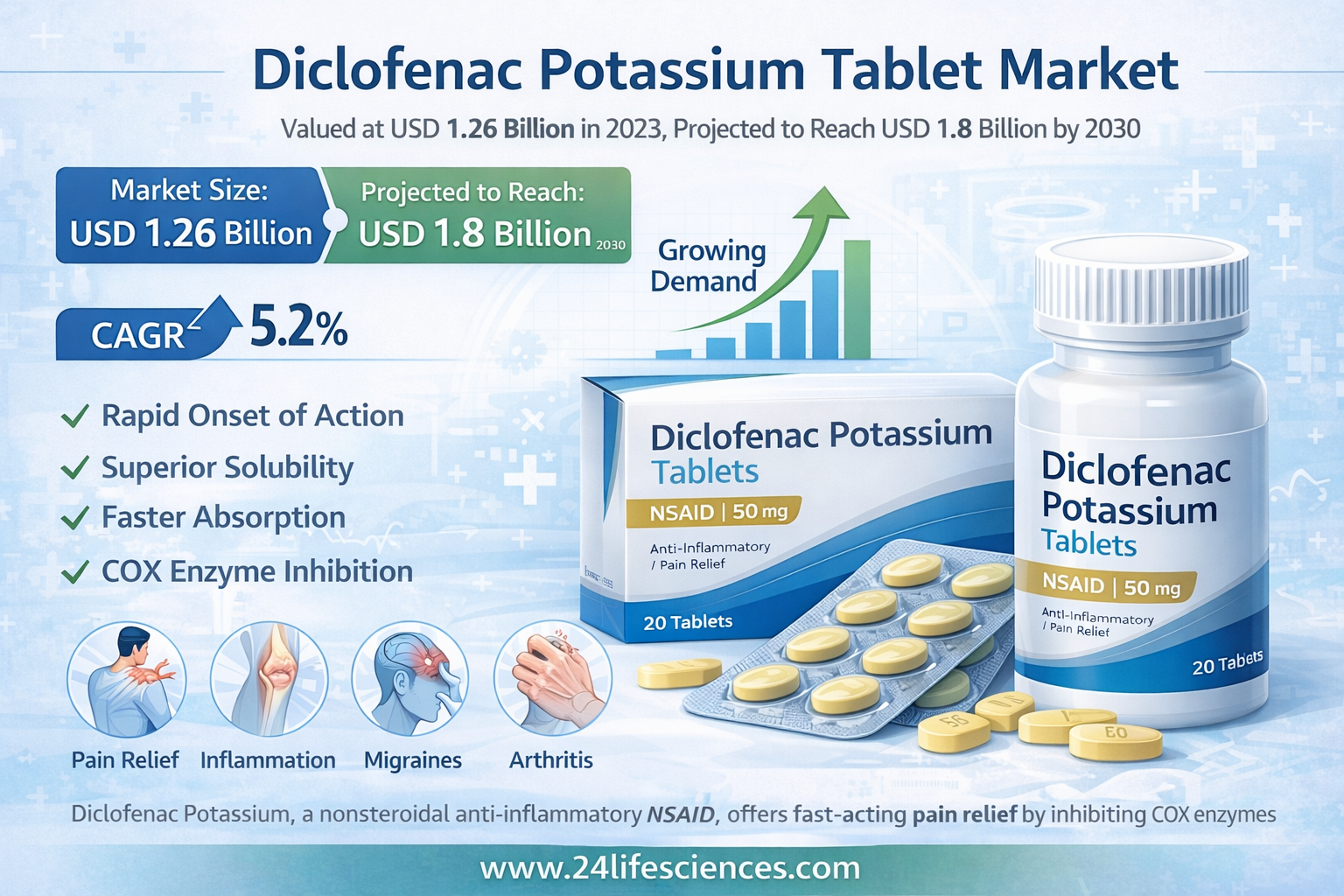 According to a newly published market research report by 24LifeSciences, global Diclofenac Potassium Tablet market was valued at USD 1.26 billion in 2023 and is projected to reach USD 1.8 billion by 2030, growing at a compound annual growth rate (CAGR) of 5.2% during the forecast period 2024–2030.