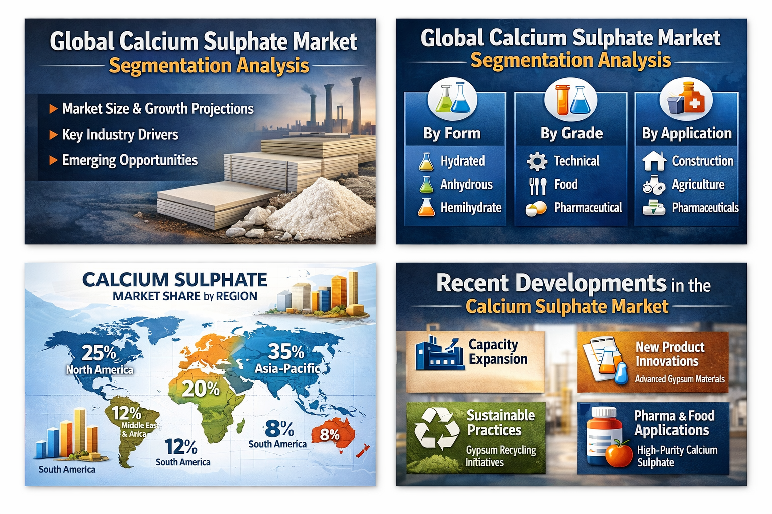 Another key aspect of the report coverage is regional analysis, which evaluates market performance across major geographic regions including North America, Europe, Asia-Pacific, the Middle East & Africa, and South & Central America. The regional analysis highlights differences in demand patterns, infrastructure development, industrial growth, and agricultural practices that influence calcium sulphate consumption in each region.