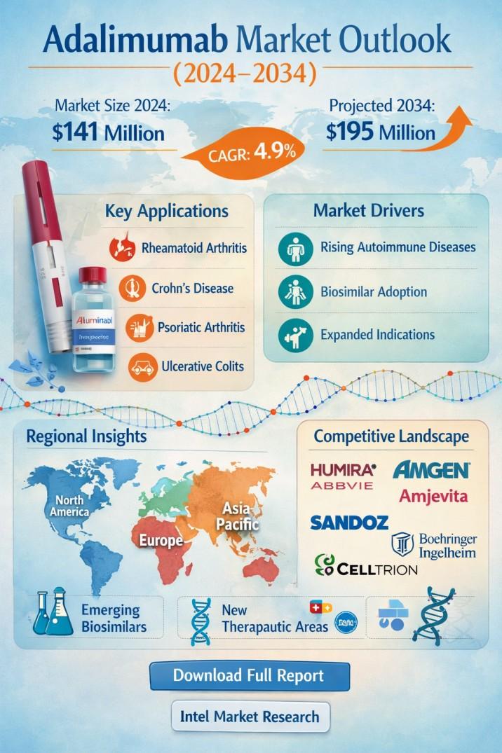 According to a new report from Intel Market Research, the global Adalimumab Market was valued at USD 141 million in 2024 and is projected to reach USD 195 million by 2034, growing at a CAGR of 4.9% during the forecast period (2025–2034). This growth is primarily driven by the increasing prevalence of autoimmune diseases and expanding treatment indications for adalimumab.