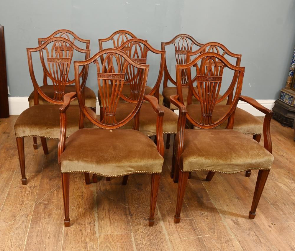 This carefully curated set includes two armchairs and six side chairs, all sharing the same elegant design and proportions. The armchairs feature gently curved arms that complement the shield back design while providing additional comfort for the host or guests seated at the ends of the table.