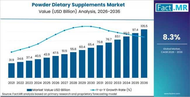 The global powder dietary supplements market is entering a transformative era of structural growth. Valued at USD 43.74 billion in 2025, the industry is projected to reach USD 47.54 billion in 2026, before climbing to a staggering USD 105.53 billion by 2036. This represents a robust compound annual growth rate (CAGR) of 8.3% over the ten-year forecast period.