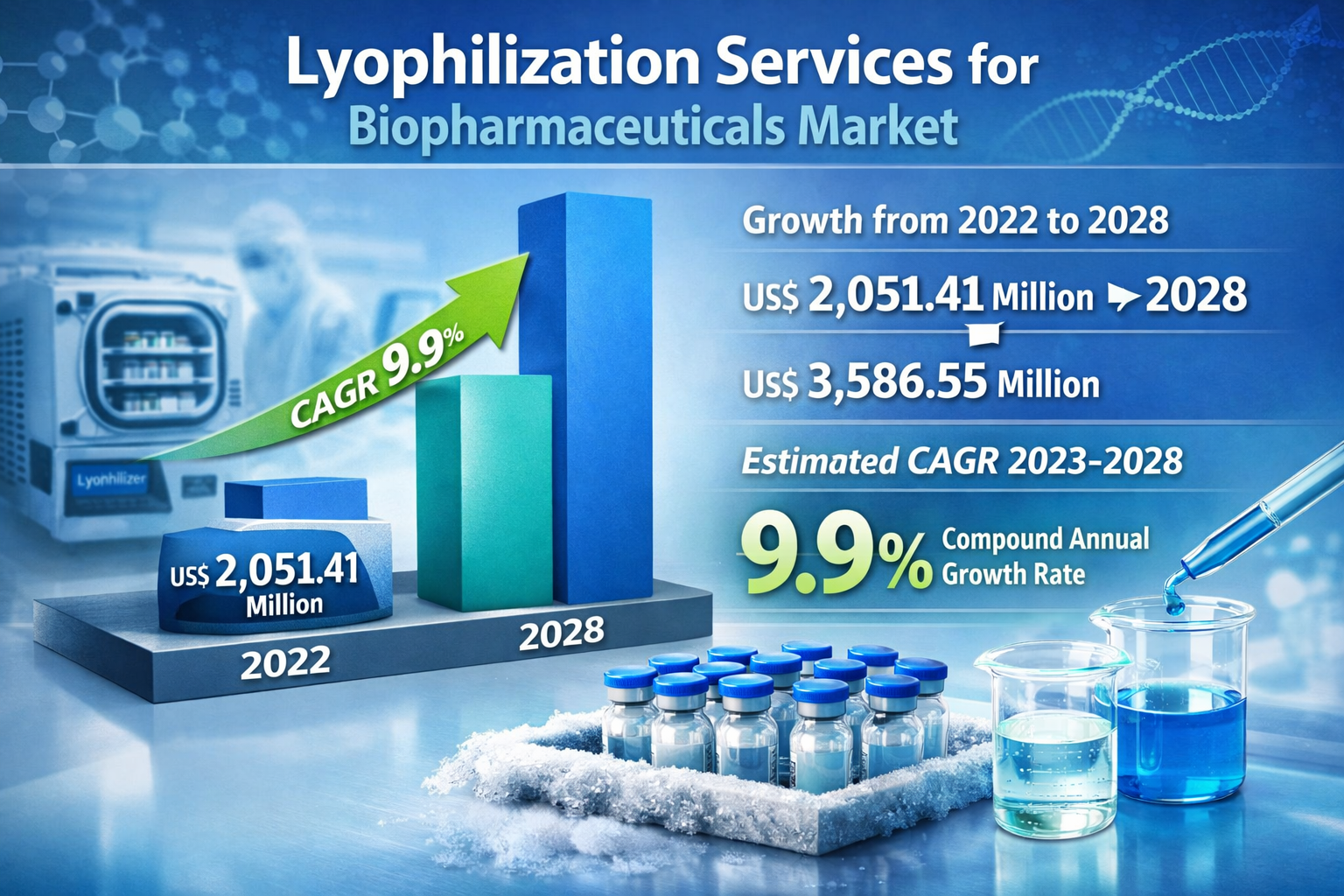 The Lyophilization Services for Biopharmaceuticals Market is witnessing rapid growth due to the increasing demand for biologic drugs that require stable preservation for effective storage and distribution. Lyophilization, also known as freeze-drying, plays a crucial role in stabilizing biologic products such as vaccines, monoclonal antibodies, gene therapies, and peptides, which are often sensitive to temperature and moisture. The lyophilization services for biopharmaceuticals market is expected to grow from US$ 2,051.41 million in 2022 to US$ 3,586.55 million by 2028; it is estimated to register a CAGR of 9.9% from 2023 to 2028. This process involves freezing the drug, reducing its pressure, and allowing sublimation to remove moisture, thereby maintaining the product’s potency over time.