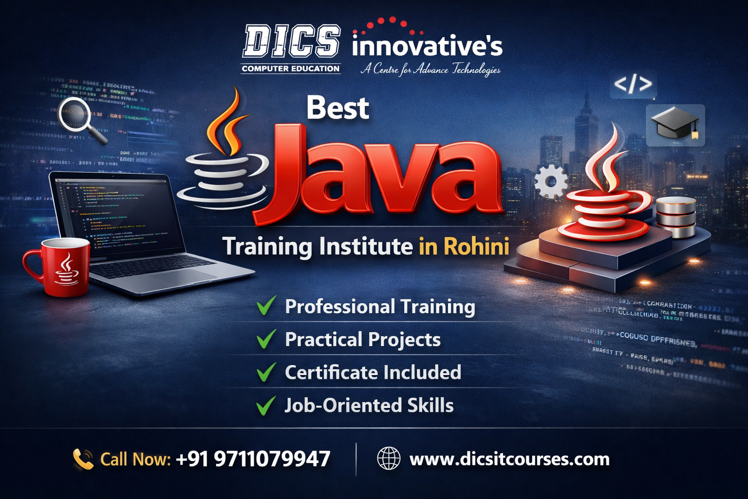 DICS Rohini offers a comprehensive Java course designed for beginners as well as professionals who want to upgrade their skills. With practical training, live projects, and industry-oriented curriculum, DICS Rohini helps students become job-ready.