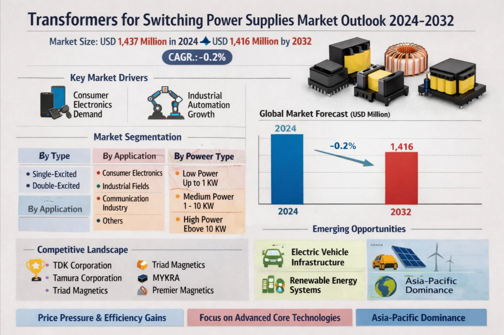 Global Transformers for Switching Power Supplies Market was valued at USD 1,437 million in 2024 and is projected to reach USD 1,416 million by 2032, exhibiting a CAGR of -0.2% during the forecast period, as detailed in a new comprehensive report published by Semiconductor Insight. This market analysis underscores the indispensable function of transformers as critical components in modern power electronics, enabling efficient voltage conversion, isolation, and regulation across a vast spectrum of devices and industrial systems.