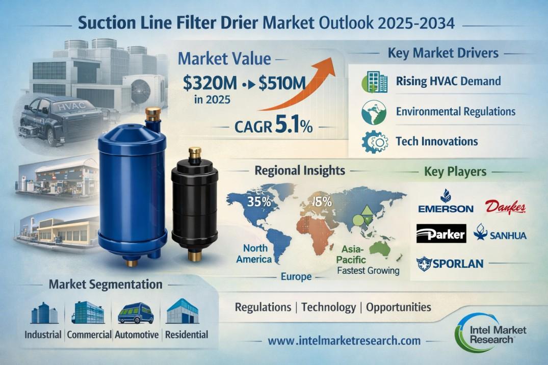 According to a new report from Intel Market Research, the global Suction Line Filter Drier market was valued at USD 320 million in 2025 and is projected to reach USD 510 million by 2034, growing at a CAGR of 5.1% during the forecast period (2026-2034). This growth is driven by increasing demand for HVAC systems, stricter refrigeration standards, and technological advancements in filtration technology.