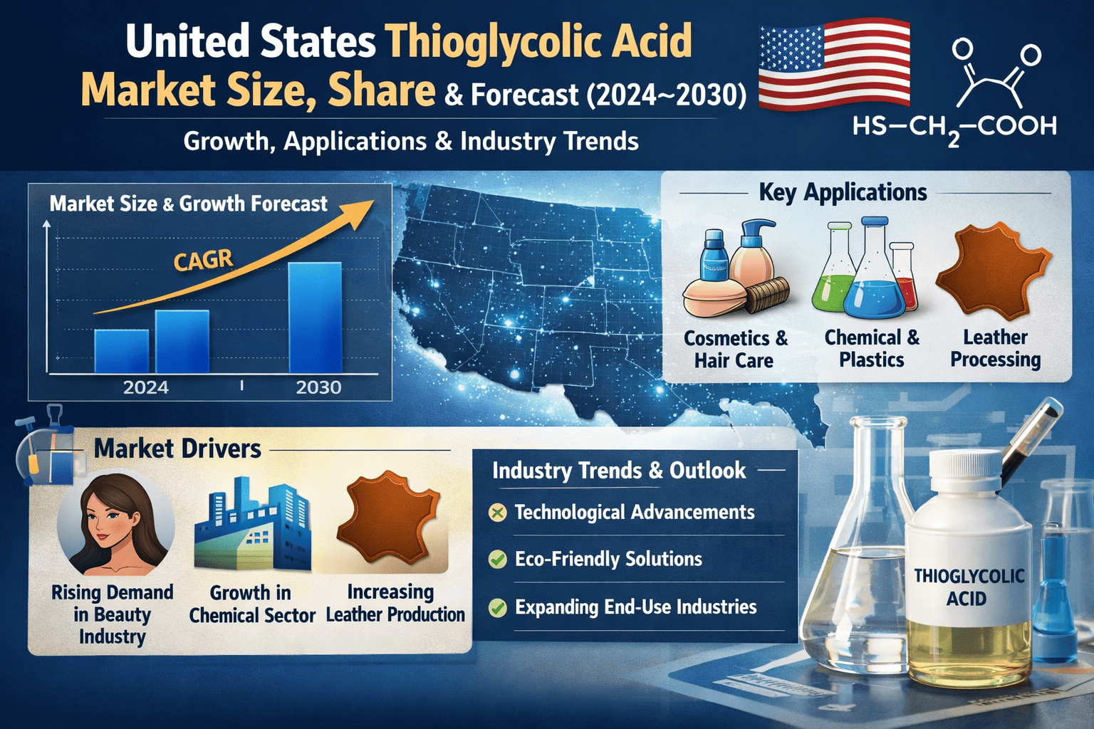 United States Thioglycolic Acid market continues to exhibit steady growth, with its valuation reaching $87.5 million in 2024. According to comprehensive industry analysis, the market is projected to grow at a CAGR of 4.6%, reaching approximately $114.3 million by 2030. This growth trajectory stems from expanding applications across personal care and industrial sectors, particularly in hair care formulations and specialty chemical applications.