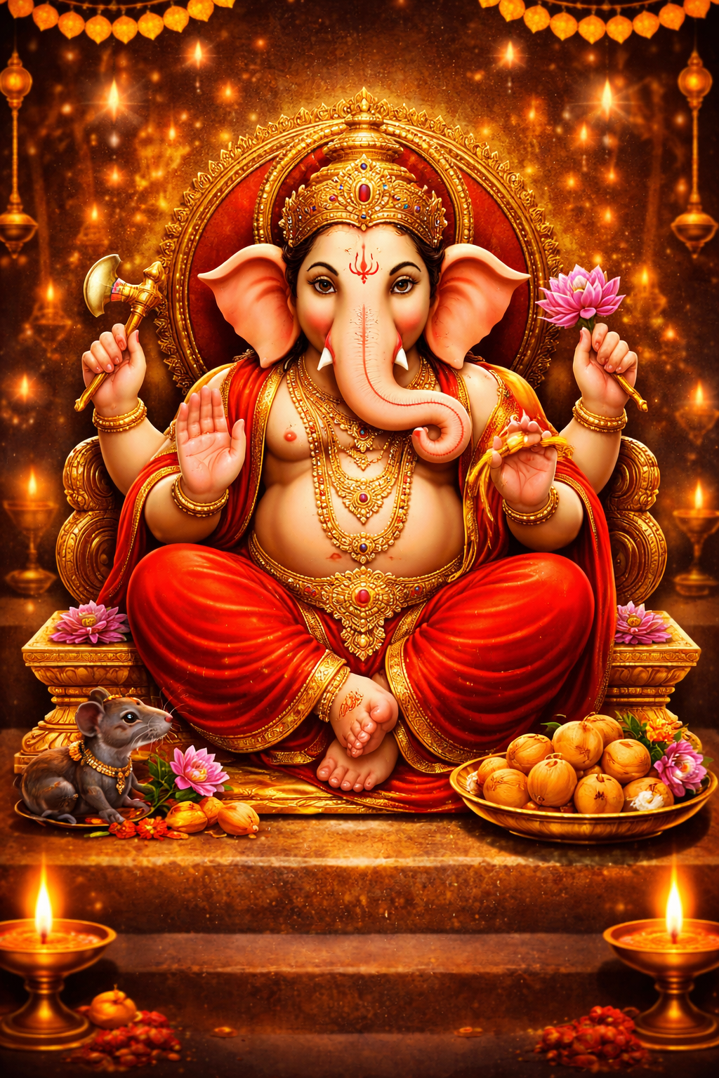 Offer modak or laddus, fruits, coconut, incense sticks, and a diya (lamp). These are considered very dear to Ganesha.
