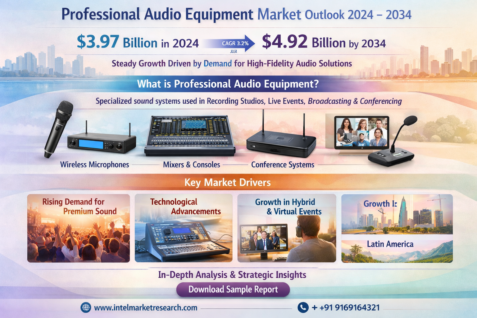 According to a new report from Intel Market Research, the global Professional Audio Equipment market was valued at USD 3.97 billion in 2024 and is projected to reach USD 4.92 billion by 2034, growing at a steady CAGR of 3.2% during the forecast period (2026–2034). This growth stems from increasing demand for high-fidelity audio solutions across entertainment, corporate, and media sectors, coupled with technological advancements in digital signal processing and wireless connectivity.