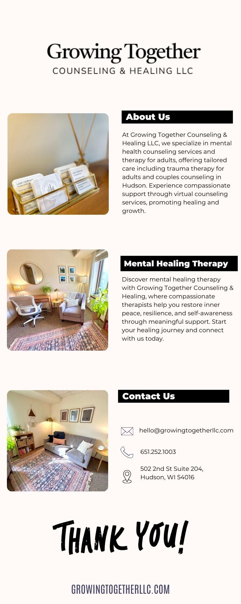 Discover mental healing therapy with Growing Together Counseling & Healing, where compassionate therapists help you restore inner peace, resilience, and self-awareness through meaningful support. Start your healing journey and connect with us today.