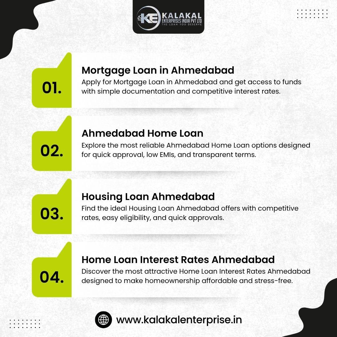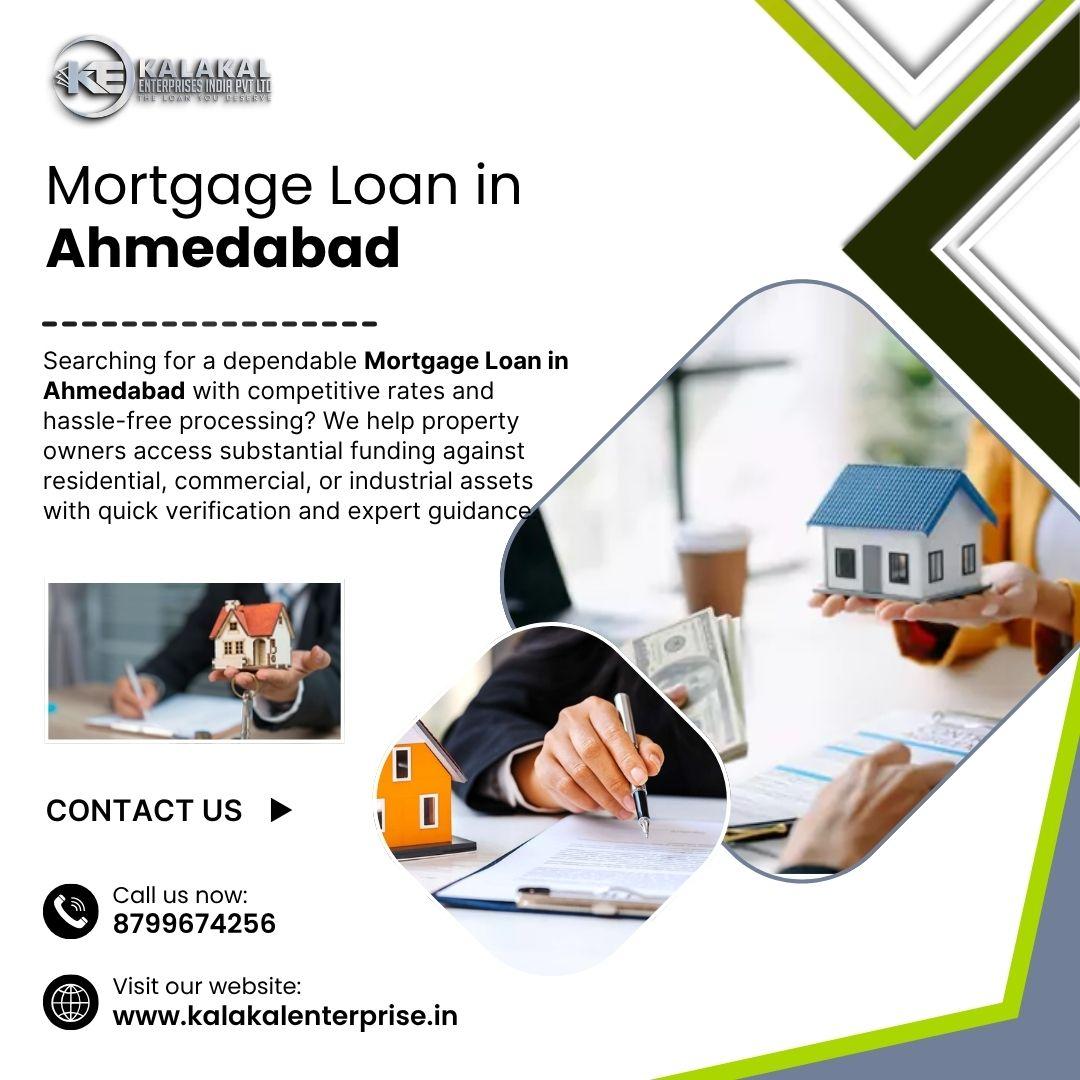 - Apply for Mortgage Loan in Ahmedabad and get access to funds with simple documentation and competitive interest rates. Whether for business growth, emergencies, or personal expenses, this loan ensures quick processing and flexible repayment plans. Leverage your property value to secure higher loan amounts with trusted financial guidance. Enjoy a smooth and transparent loan journey tailored to your needs with KALAKAL ENTERPRISE INDIA PRIVATE LIMITED