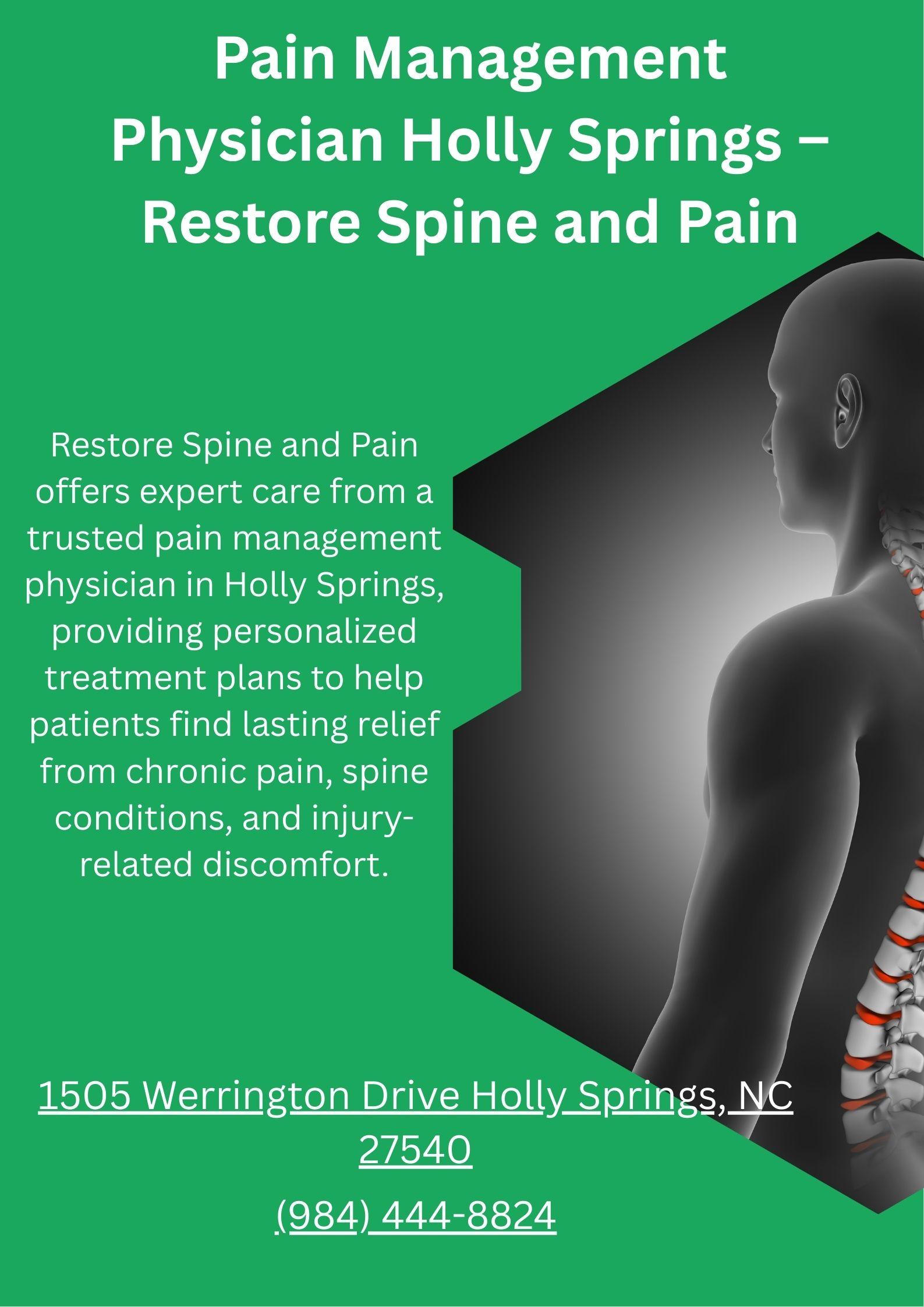 Restore Spine and Pain provides expert care with a trusted pain management physician in Holly Springs, offering personalized, non-surgical treatments to relieve chronic pain, improve mobility, and help patients return to a healthier, more active life.