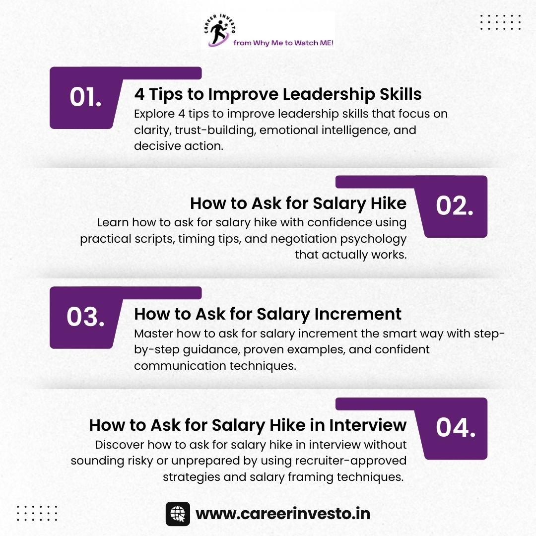 Explore 4 tips to improve leadership skills that focus on clarity, trust-building, emotional intelligence, and decisive action. This easy-to-follow guide helps professionals strengthen leadership presence and improve team performance without complexity. Perfect for working professionals and entrepreneurs looking for fast results. Apply these leadership techniques today to stand out and accelerate career growth with expert insights shared by CareerInvesto.