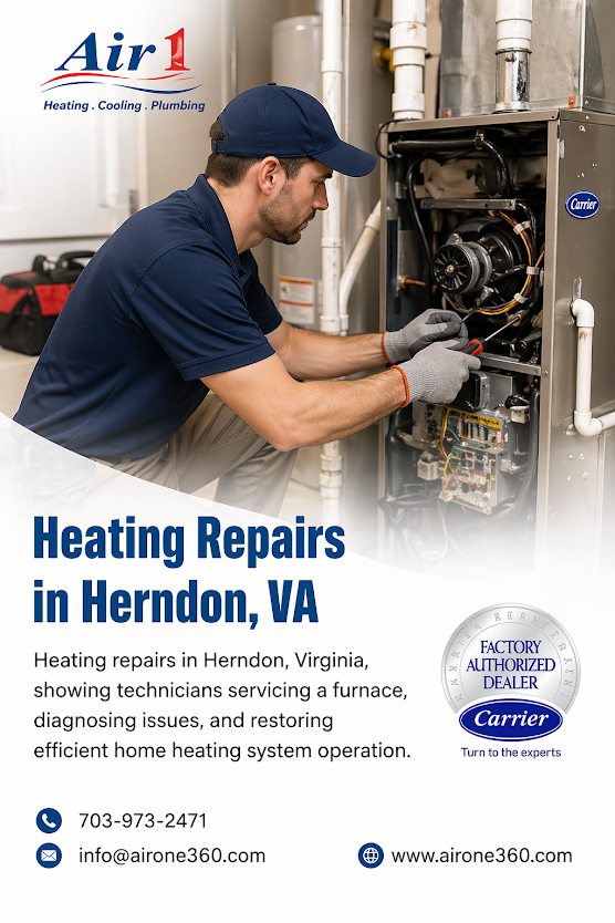 Heating Repairs in Herndon VA Professional heating repair technicians in Herndon, Virginia inspect and service residential HVAC systems, diagnosing furnace issues, replacing faulty parts, and ensuring efficient warmth. The image shows skilled work, tools, and a well-maintained home heating unit during maintenance service call visit. Live link-: https://airone360.com/heating-repairs-in-herndon-va/ visit for website: https://airone360.com/ Business Listing- https://share.google/U66AsBZ80UpG7Evke