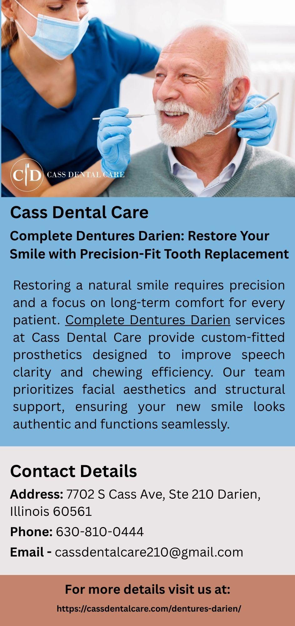 Restoring a natural smile requires precision and a focus on long-term comfort for every patient. Complete Dentures Darien services at Cass Dental Care provide custom-fitted prosthetics designed to improve speech clarity and chewing efficiency. Our team prioritizes facial aesthetics and structural support, ensuring your new smile looks authentic and functions seamlessly. Visit us to discover how complete dentures can transform your daily comfort and confidence at https://cassdentalcare.com/dentures-darien/