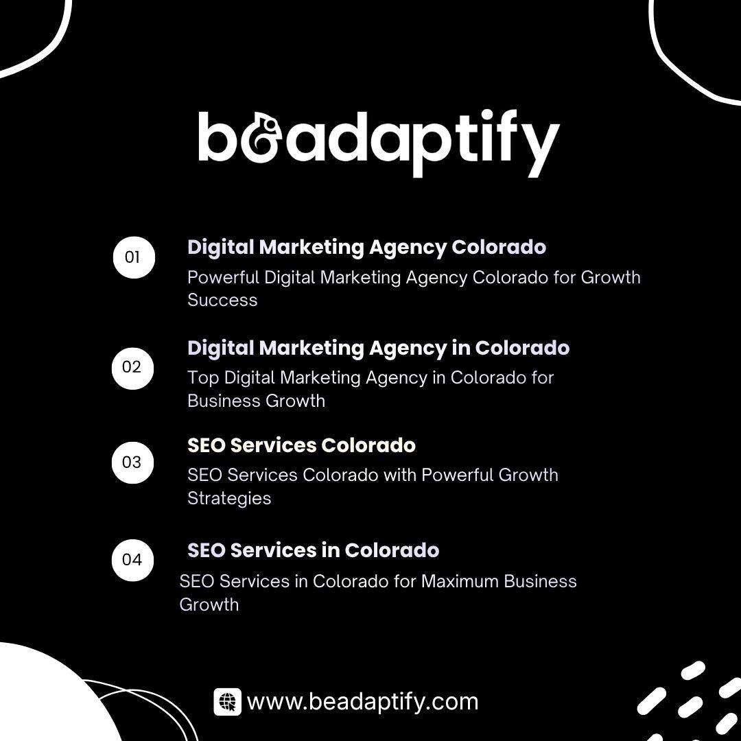 Digital Marketing Agency in Colorado offering result-focused strategies that enhance online presence, increase traffic, and maximize ROI for businesses of all sizes. From local SEO to advanced PPC campaigns, every solution is crafted to meet Colorado market demands and deliver sustainable growth. Work with a team that prioritizes conversions, brand authority, and long-term success through proven digital techniques with Beadaptify Innovations
