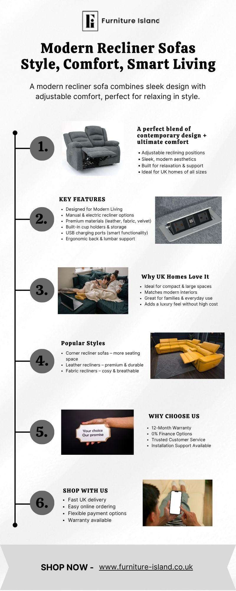 Modern Recliner Sofas in the UK: A Stylish Twist on Comfort Upgrade your living space with modern recliner sofas in the UK that combine sleek design with superior comfort. These sofas feature innovative reclining mechanisms and contemporary aesthetics, making them the ideal addition to any modern home. Whether you’re looking for a minimalist or bold statement piece, modern recliner sofas offer both relaxation and style, ensuring your living room becomes a space for ultimate comfort and elegance. Buy now: https://www.furniture-island.co.uk/collections/sofa-recliner