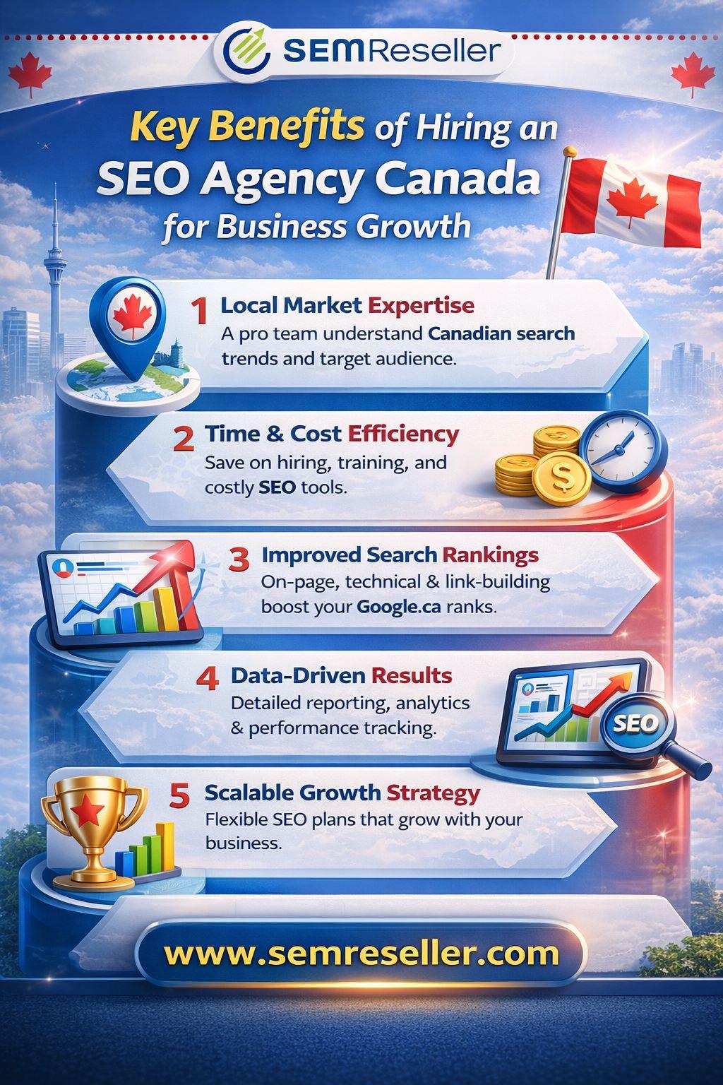 Key Benefits of Hiring an SEO Agency Canada for Business Growth Working with an experienced SEO Agency Canada allows you to focus on running your business while experts handle your online visibility. From targeting the right audience to improving search performance and delivering clear monthly progress, it’s a practical way to gain steady traffic, stronger leads, and long-term growth without building a full in-house team. Visit us: https://www.semreseller.com/local-seo-company-canada