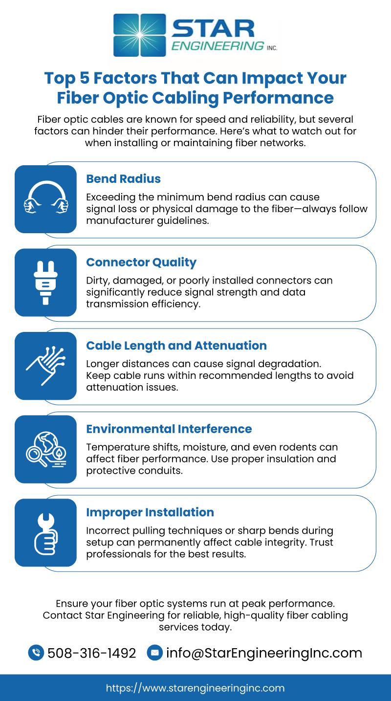 Top 5 Factors That Can Impact Your Fiber Optic Cabling Performance Fiber optic cables are known for speed and reliability, but several factors can hinder their performance. Here's what to watch out for when installing or maintaining fiber networks. Contact Star Engineering for reliable, high-quality fiber cabling services today. https://www.starengineeringinc.com/