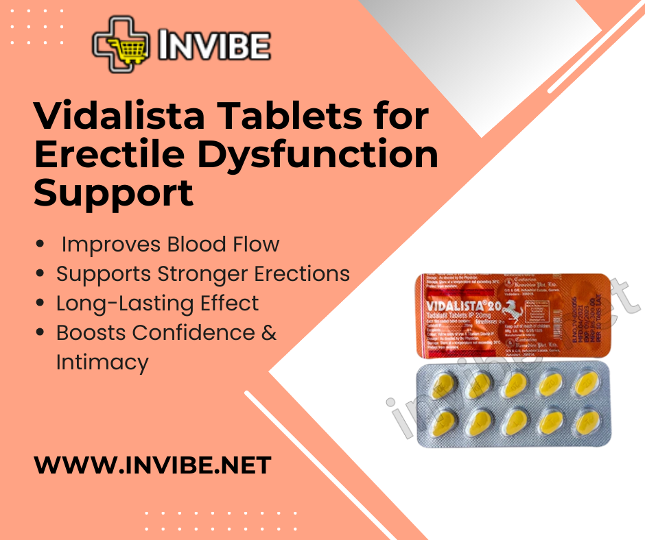 Vidalista tablets are widely used to treat men with erectile dysfunction by enhancing blood flow. Vidalista tablets are known for their efficacy and long-acting results, which help boost confidence and performance. Vidalista tablets is widely preferred by men who are looking for a trusted solution to support their intimate wellness. For more info visit at : https://invibe.net/tadalafil/vidalista