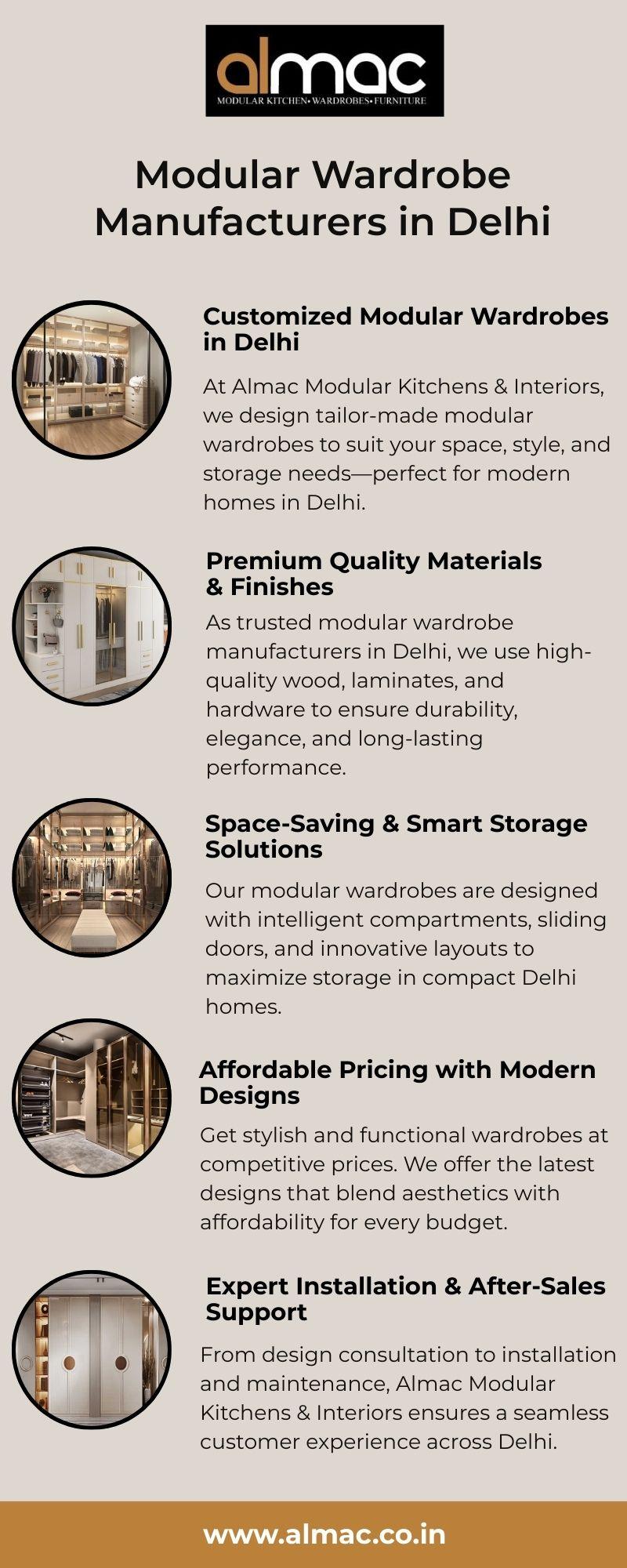 Looking for trusted modular wardrobe manufacturers in Delhi? Almac Modular Kitchens & Interiors offers stylish, space-saving, and customized wardrobe solutions for modern homes. Our designs combine functionality, premium materials, and elegant finishes to enhance your space. Choose expert craftsmanship and innovative storage solutions that deliver durability, aesthetics, and convenience tailored to your lifestyle and home interior needs.