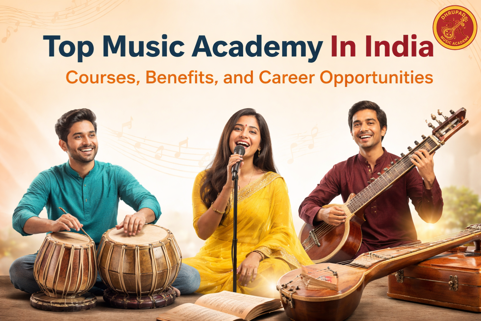 Top Music Academy In India: Courses, Benefits, and Career Opportunities This banner highlights passionate musicians practicing tabla, vocals, and classical instruments, representing quality training and tradition. It reflects how a top music academy nurtures talent, offers structured courses, and opens career opportunities in Indian classical and contemporary music. Visit for More: dhrupadmusicacademy.com