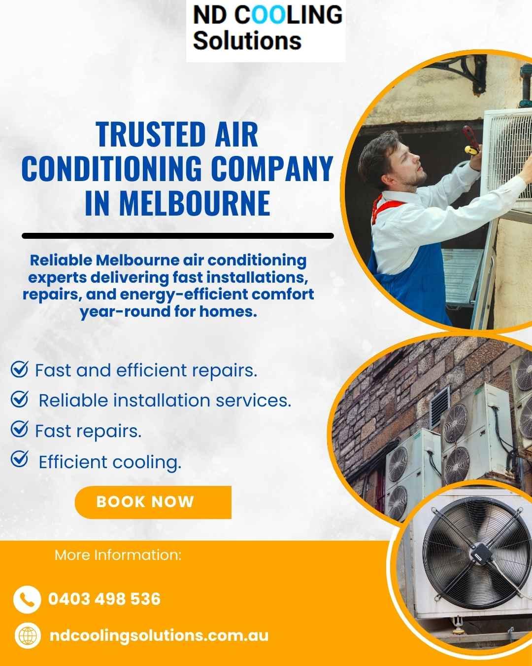 Trusted Air Conditioning Company Melbourne A trusted air conditioning company Melbourne is essential for maintaining year-round comfort in homes and businesses. With expert guidance, proper installation, and attention to detail, a reliable provider ensures your system runs smoothly and efficiently. Choosing experienced professionals helps reduce future issues and delivers lasting comfort you can depend on. For more information or to request a free quote, contact us today: Phone: 0403 498 536 Email: sales@ndcoolingsolutions.com.au Website: https://ndcoolingsolutions.com.au/ Location: Melbourne, Australia