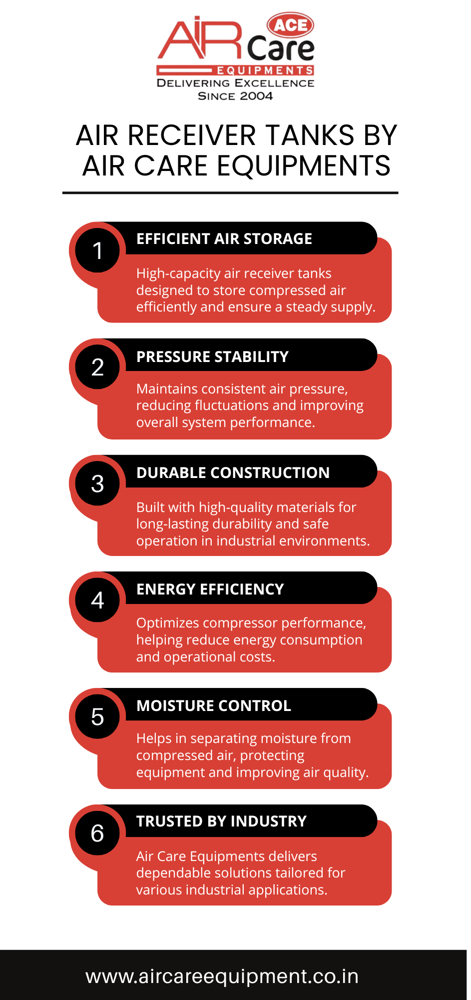 • Air Care Equipments offers industrial air receiver tanks designed for optimal air storage and consistent pressure control. Our tanks improve compressor efficiency, reduce load cycles, and enhance overall system performance. Ideal for various industries, they ensure durability, safety, and reliable operation.