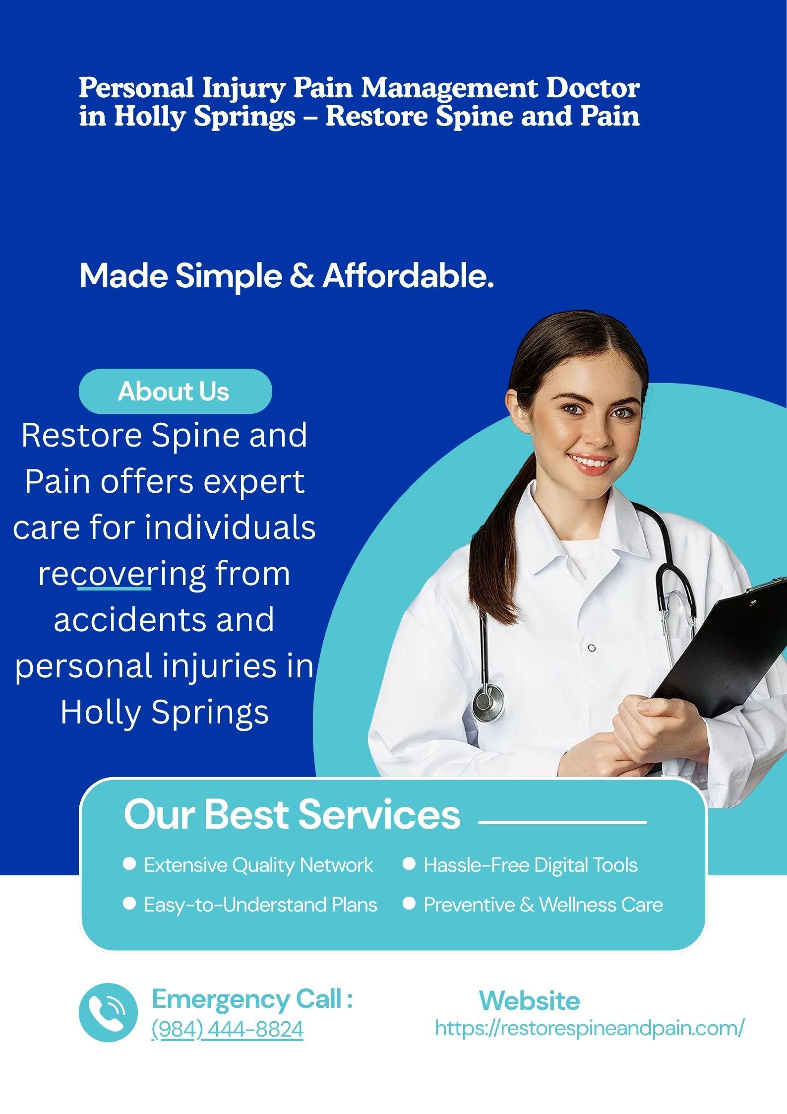 Personal Injury Pain Management Doctor in Holly Springs – Restore Spine and Pain Restore Spine and Pain offers expert care for individuals recovering from accidents and personal injuries in Holly Springs. Our experienced team specializes in diagnosing and treating injury-related pain, including neck pain, back pain, whiplash, and joint discomfort Visit : https://restorespineandpain.com/accident-care/