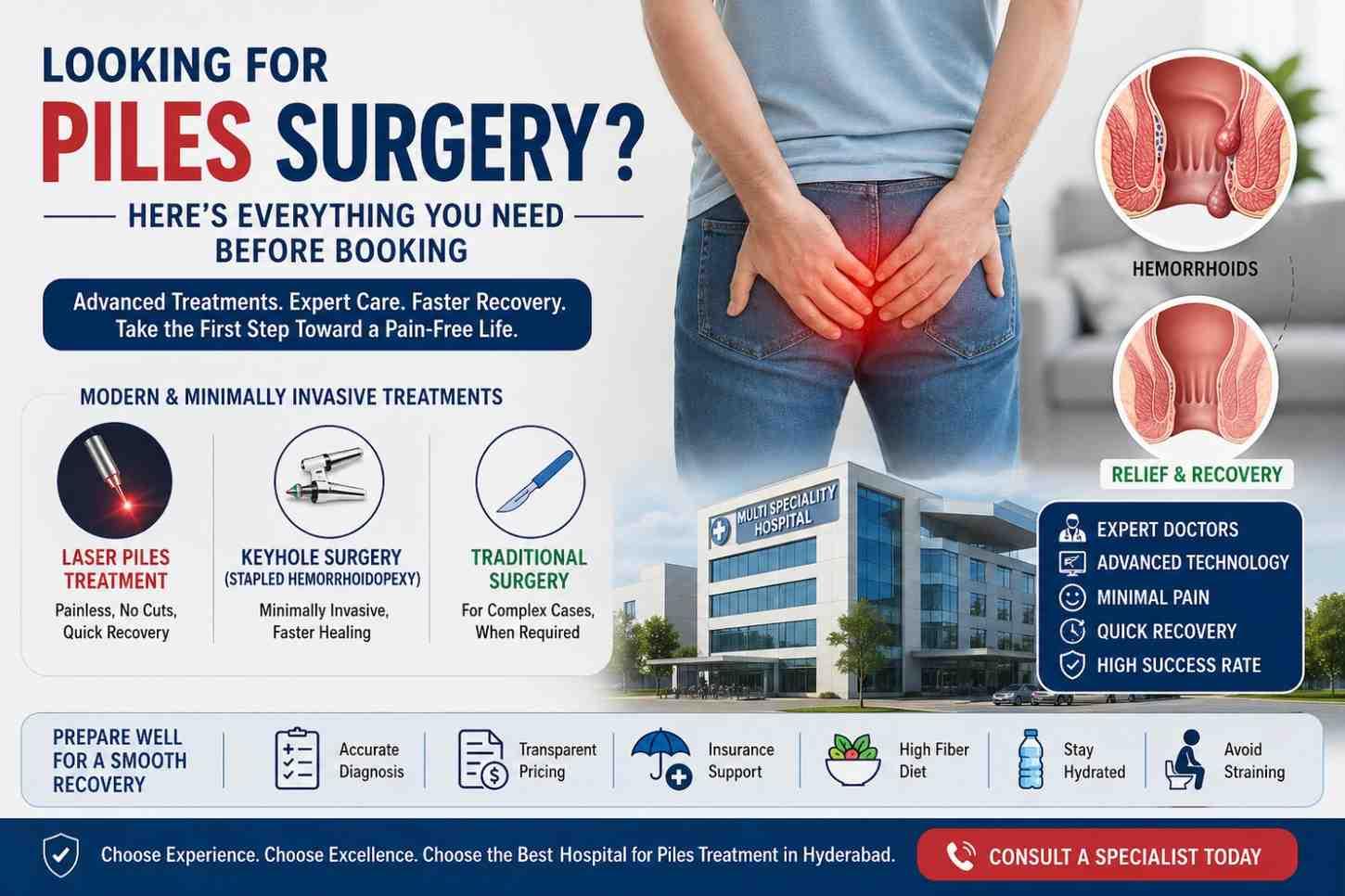 Get precise piles treatment Hyderabad from an experienced team at the best hospital for piles treatment in Hyderabad. Our centre, known as a trusted Piles hospital in Hyderabad, uses modern approaches that reduce pain, recovery time, and recurrence — ensuring a comfortable experience from start to finish.