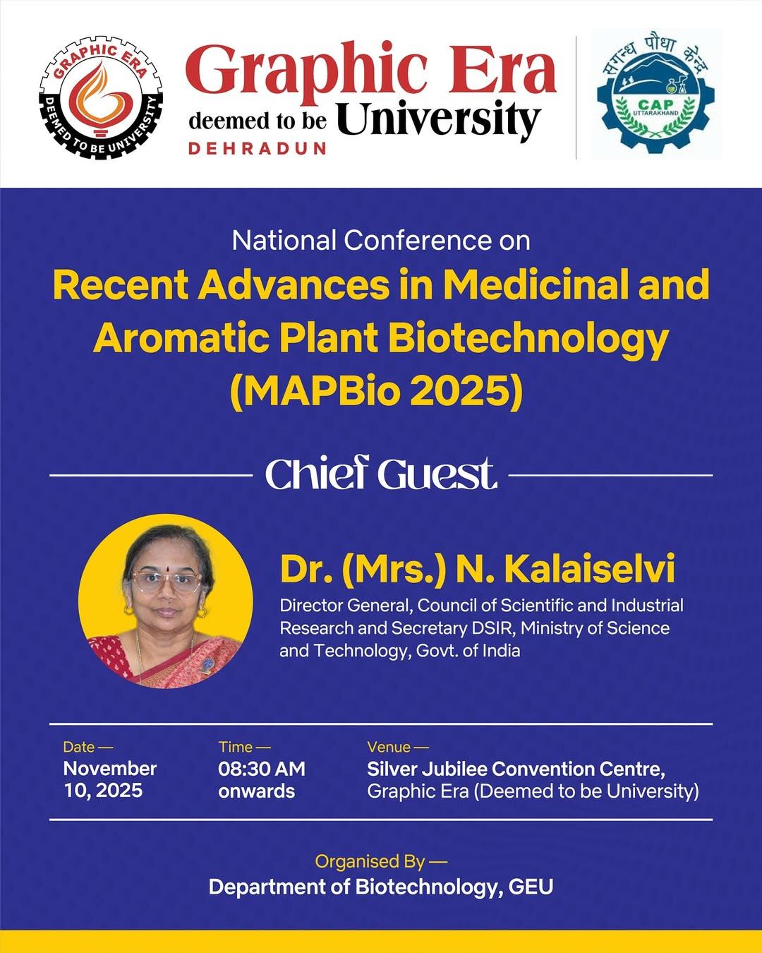 Graphic Era (Deemed to be University), Dehradun is honored to welcome Dr. (Mrs.) N. Kalaiselvi, Director General, CSIR & Secretary, DSIR, Ministry of Science & Technology, Govt. of India, as the Chief Guest at the National Conference MAPBio 2025.