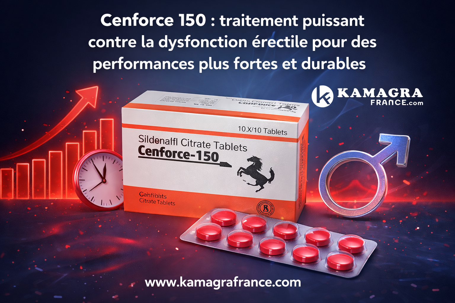 Cenforce 150 est un médicament à forte dose utilisé pour traiter la dysfonction érectile (DE) chez les hommes, leur permettant d’obtenir et de maintenir une érection ferme pendant l’activité sexuelle. Contenant du citrate de sildénafil, le même ingrédient actif que celui présent dans des médicaments populaires contre la DE, Cenforce 150 agit en augmentant le flux sanguin vers la zone génitale, améliorant ainsi les performances. Cenforce 150 est recommandé pour les hommes qui ont besoin d’une dose plus élevée afin d’obtenir des résultats efficaces. Il est conseillé de prendre Cenforce 150 sous la supervision d’un professionnel de santé afin d’en tirer des bénéfices optimaux. Pour plus d'informations, veuillez consulter le site : https://kamagrafrance.com/sildenafil/cenforce-150