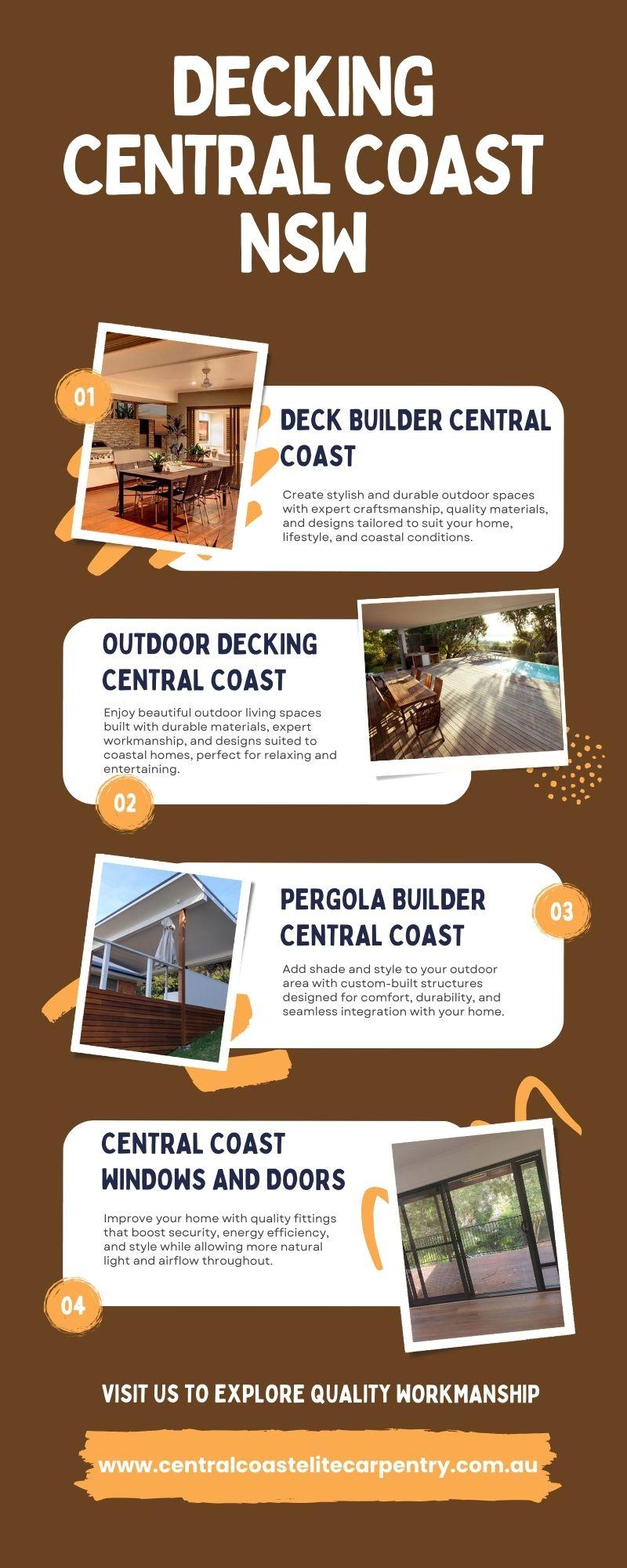 Outdoor Decking Central Coast for Modern Coastal Homes Create a welcoming outdoor space designed for everyday comfort and coastal living. Our experienced team delivers practical designs, strong materials, and neat finishes to suit your home and lifestyle. Each project is carefully planned and built to last in local conditions. As a trusted Outdoor decking Central Coast, we create functional areas ideal for relaxing, entertaining, and adding value to your property. Enjoy low-maintenance outdoor living with quality workmanship and a clean, modern finish. If you want to know more, visit us: https://www.centralcoastelitecarpentry.com.au/our-services/outdoor-living-central-coast